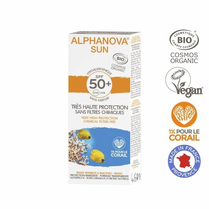 Intensief beschermende natuurlijke zonnebrandcrème SPF50, geschikt voor het gezicht. Speciaal ontwikkeld voor volwassenen met een zeer gevoelige huid én voor mensen die een veilige hoge SPF wensen. Zorgeloos, verantwoord en perfect beschermd van de zon genieten doe je met Alphanova sun dankzij de 100% natuurlijke (minerale) filters.