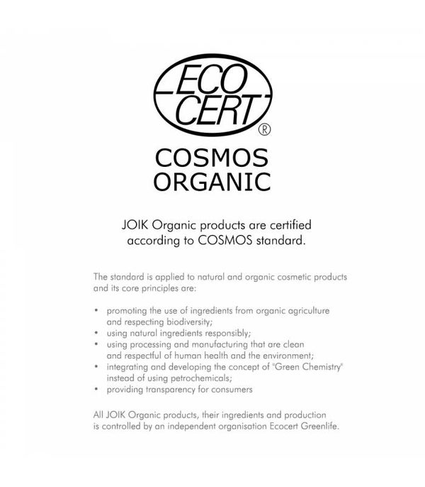 COSMOS ORGANIC certified by Ecocert Greenlife according to COSMOS Standard.