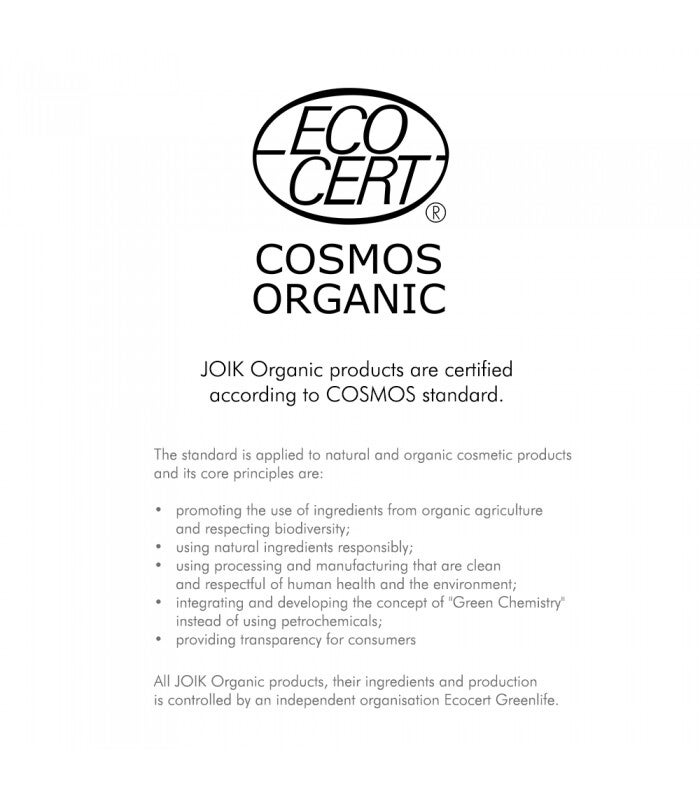 COSMOS ORGANIC certified by Ecocert Greenlife according to COSMOS Standard.