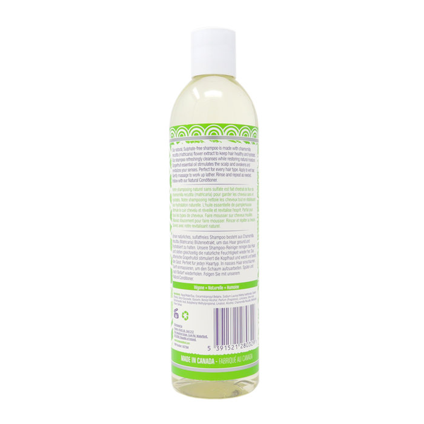 Onze natuurlijke, sulfaatvrije shampoo is gemaakt met chamomilla recutita (matricaria) bloemextract om het haar gezond en gehydrateerd te houden. Onze shampoo reinigt verfrissend en herstelt de natuurlijke vochtigheid. Essentiële olie van grapefruit stimuleert de hoofdhuid en revitaliseert je zintuigen. Perfect voor elk haartype.