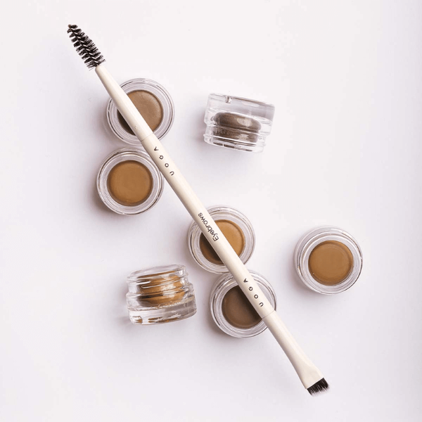 Eyebrow pomade kan het beste worden aangebracht met Uoga Uoga duo wenkbrauwgroomer en borstel. Houd de borstel in een hoek en sleep het vanuit de binnenhoek van de wenkbrauw naar buiten om zo je wenkbrauwen te kleuren.