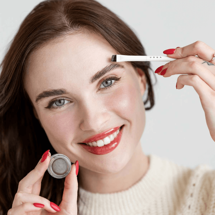 Eyebrow pomade kan het beste worden aangebracht met Uoga Uoga duo wenkbrauwgroomer en borstel. Houd de borstel in een hoek en sleep het vanuit de binnenhoek van de wenkbrauw naar buiten om zo je wenkbrauwen te kleuren.
