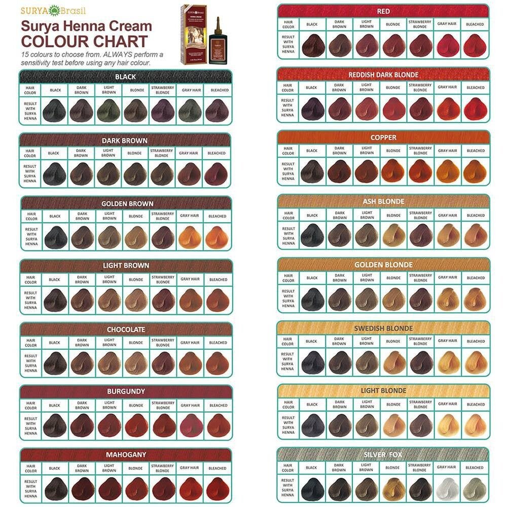 Let op: de kleuren op de verpakkingen zijn een indicatie. Wij kunnen geen identieke kleur garanderen. Surya Henna Cream geeft bij juist gebruik niet af op textiel, wel raden we aan om niet met nat haar te gaan slapen direct na het kleuren.